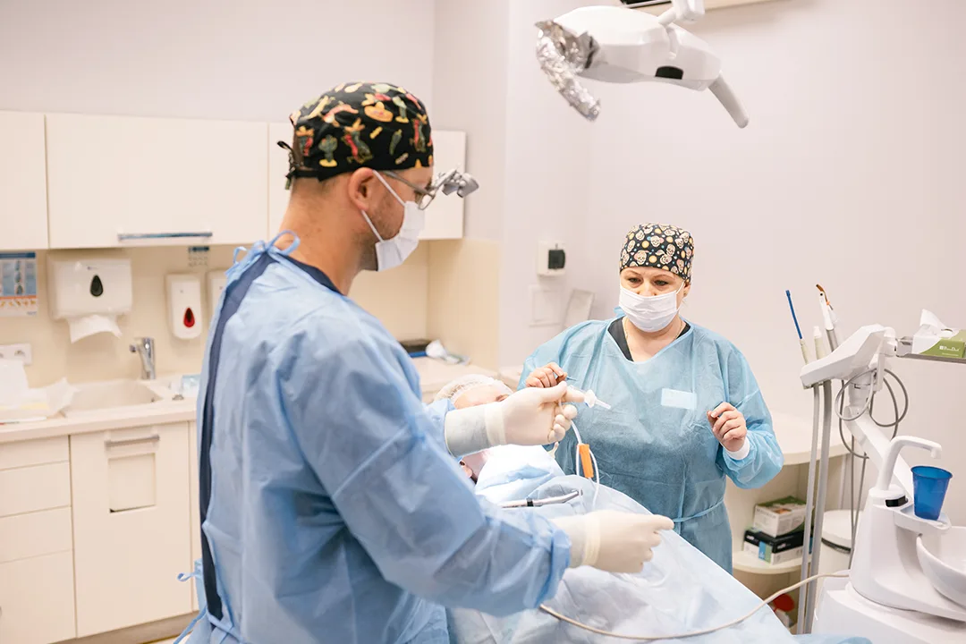 Zabiegi wykonujemy w znieczuleniu miejscowym, a w razie potrzeby wspieramy je sedacją, co minimalizuje stres i zwiększa komfort Pacjenta. Pracujemy technikami atraumatycznymi, a tam, gdzie to możliwe — z wykorzystaniem piezochirurgii, co ogranicza uszkodzenia tkanek i skraca czas gojenia. W zależności od rodzaju zabiegu procedura trwa zazwyczaj od 30 minut do 2 godzin.