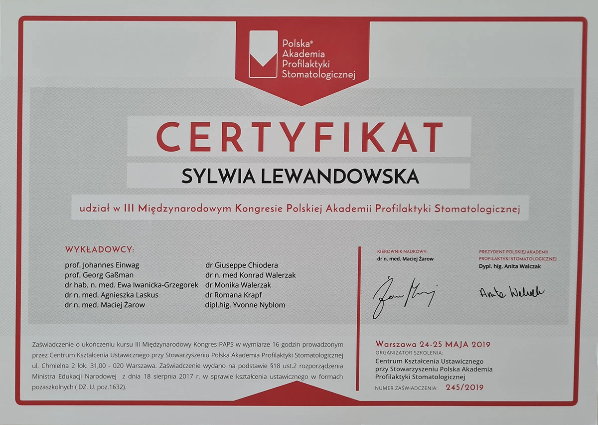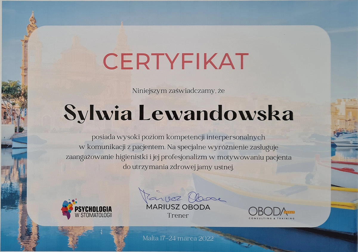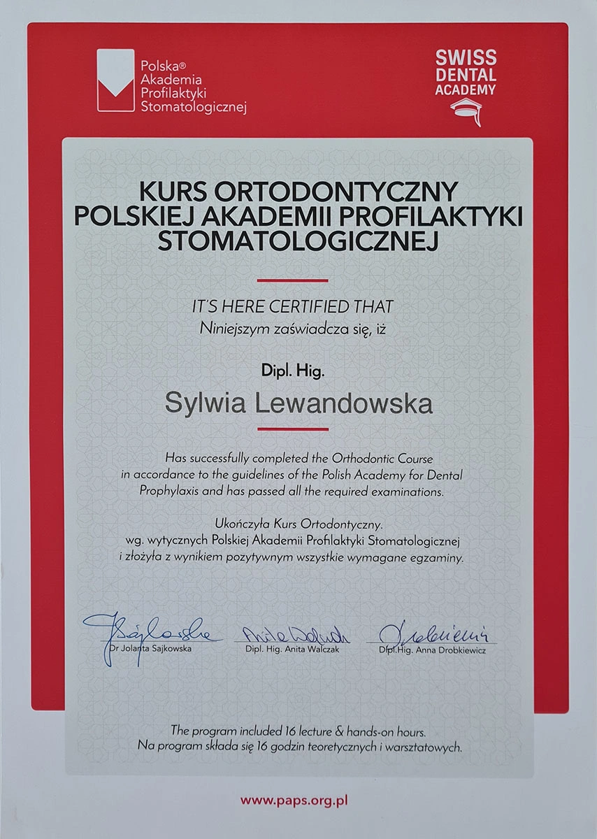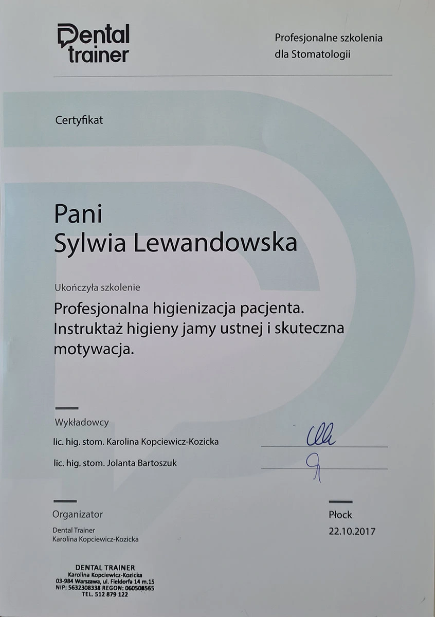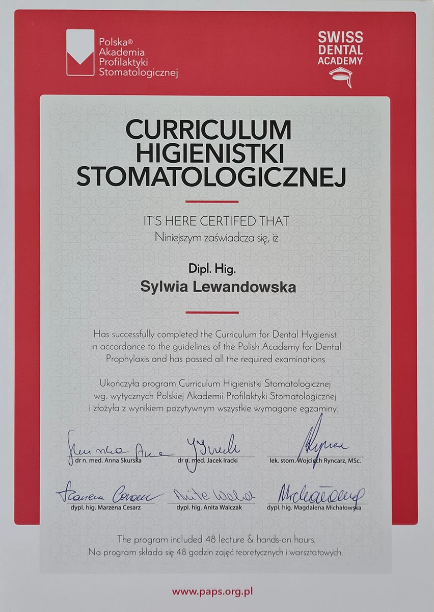Sylwia has completed numerous specialist courses, and focuses on empathy, authenticity and an individual approach in her work. As she herself emphasises, taking care of your teeth is not only a matter of aesthetics, but, above all, the health of the whole body.
